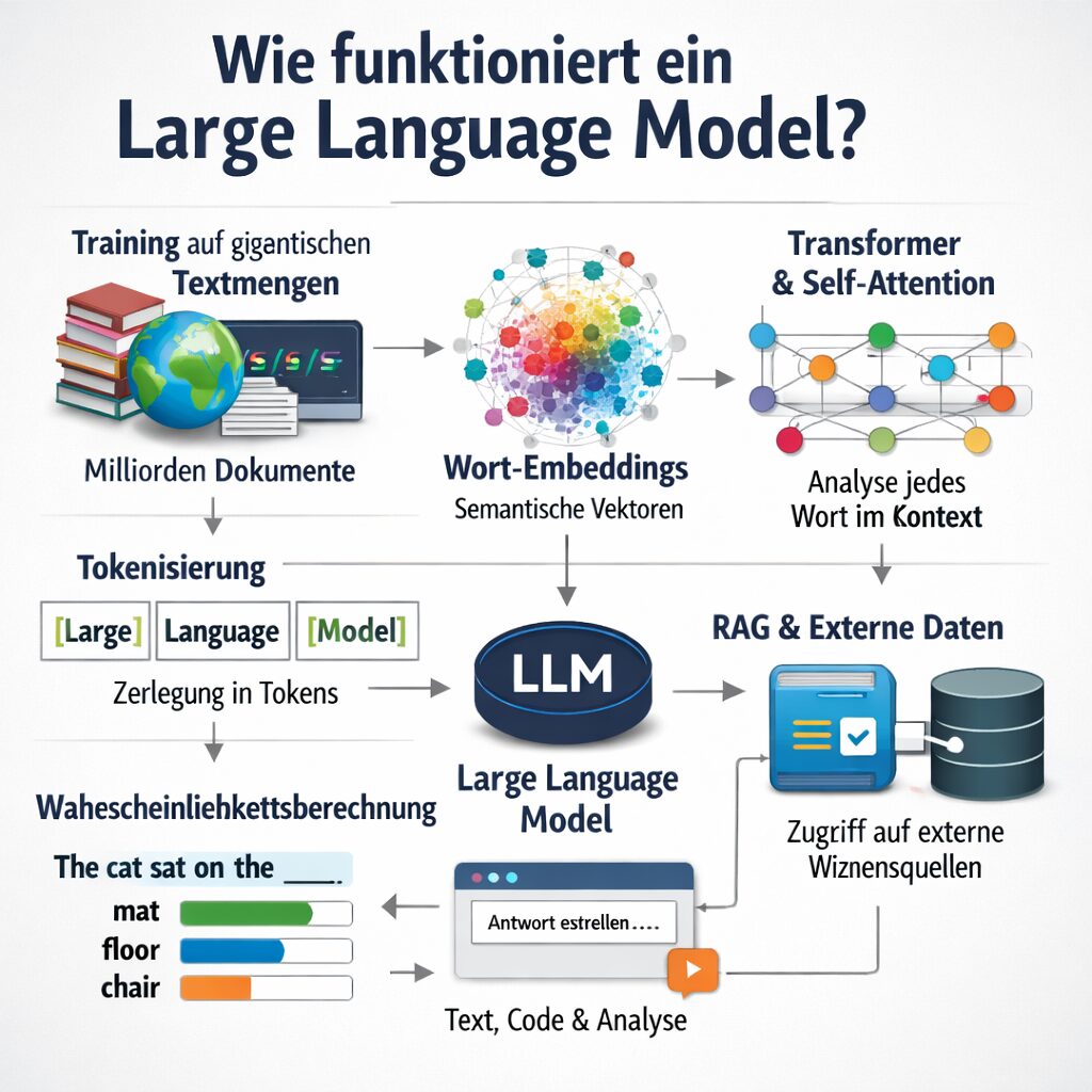 Ein LLM analysiert Sprache nicht semantisch im menschlichen Sinne, sondern statistisch. Es berechnet die Wahrscheinlichkeit, welches Wort – präziser: welcher Token – als nächstes folgt. Aus dieser scheinbar simplen Wahrscheinlichkeitsberechnung entsteht jedoch die Fähigkeit, Texte zu schreiben, Code zu generieren, Fragen zu beantworten, juristische Dokumente zusammenzufassen oder komplexe Zusammenhänge zu erklären.